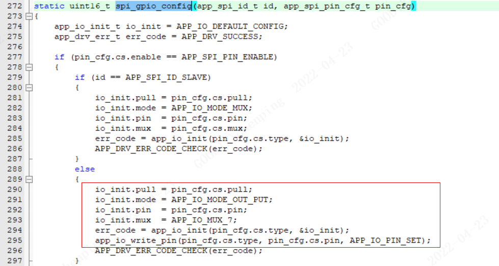 #define SPI_FLASH_CS_HIGH() app_io_write_pin(APP_IO_TYPE_AON, AON_GPIO_PIN_1, APP_IO_PIN_SET)2. APP驱动层实现了该软件控制片选方式,详情可参考components\app_drivers\src\app_spi_v2.c代码实现