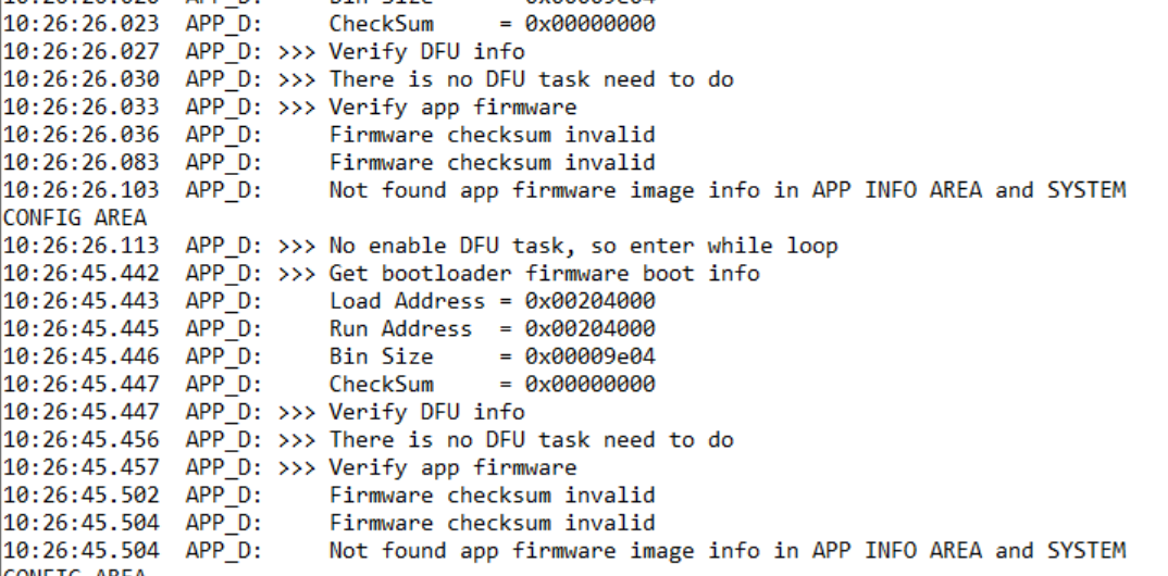 发现出现异常过后,重启后,我的主要固件就没有了,但是我用Ggrammmer去读的话发现固件还在。主要的LOG如下: