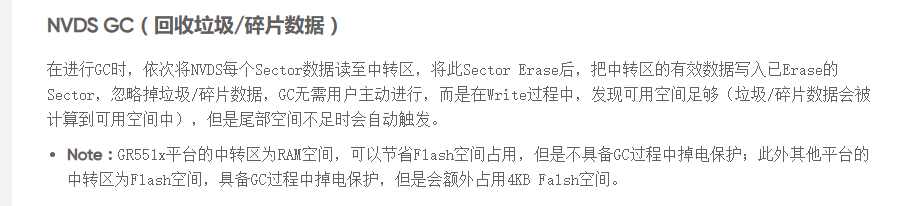 2.GR5515IGND这个芯片默认sdk里面nvds分配空间是1个扇区, nvds数据垃圾回收过程是通过ram吗?我在社区上找到了一个帖子如下,不知道是不是对的,我这边之前有个项目,掉电过程中经常会丢数据,如果是通过ram回收,估计就是这个问题,后面可能要用其他方法规避该问题