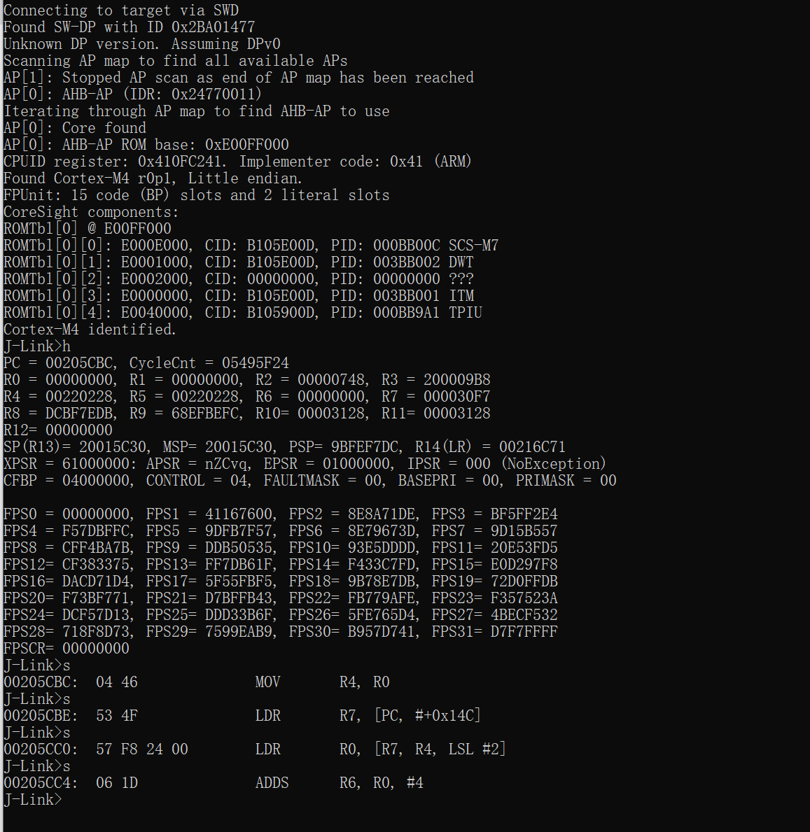 可以使用Jlink查看一下状态,如下,单步运行,看看程序在运行什么