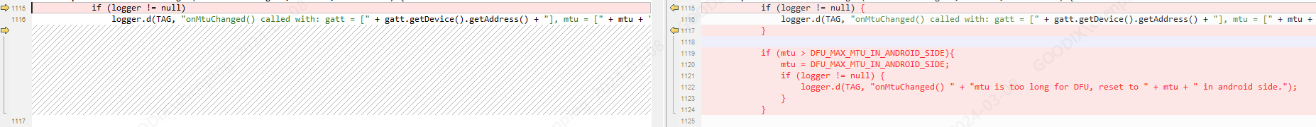 (2) APP端解决方案:基于开源架构的DFU SDK,定位到 libcom中的BlockingBle.java 中的onMtuChanged 方法,修改代码逻辑,当mtu大于247时,则重新赋值为247,如下图所示(Android_GoodixBleDFU_V2.0.2_20240305.zip版本已更新):