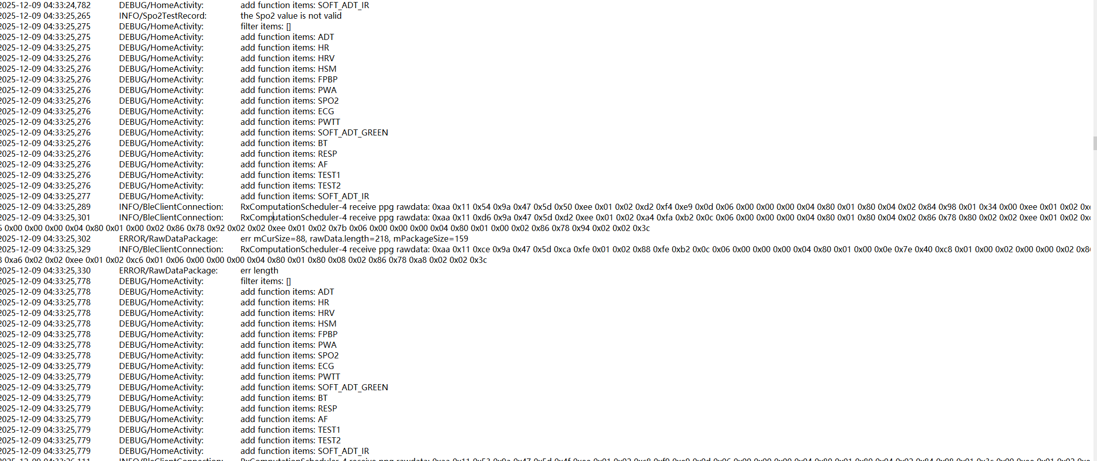 2025-12-09 05:01:09,052 INFO/BleClientConnection: RxComputationScheduler-4 receive ppg rawdata: 0xaa 0x11 0x2e 0x9a 0x47 0x5d 0x2a 0xee 0x01 0x02 0xae 0xd1 0xb1 0x0c 0x06 0x00 0x00 0x00 0x04 0x80 0x01 0x80 0x04 0x02 0x86 0x78 0xcc 0x02 0x02 0xee 0x01 0x02 0x8e 0x06 0x06 0x00 0x00 0x00 0x04 0x80 0x01 0x80 0x08 0x02 0x86 0x78 0xce 0x02 0x02 0xde