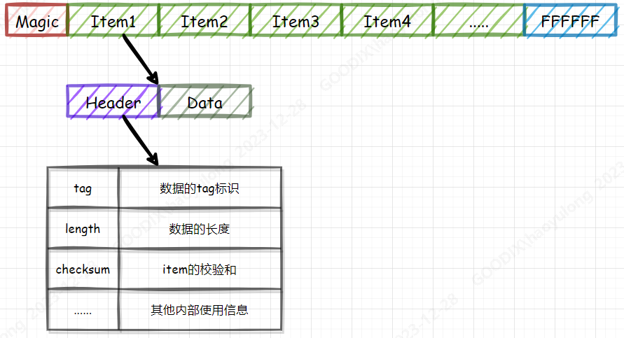 Flash中的存储结构如下图,占用连续的若干个Sector的Flash空间,其中第一个sector的起始位置会放置特殊magic,用于标识这块区域是否也被初始化为NVDS。NVDS的每个Item是由Item Header和Item Data组成。
