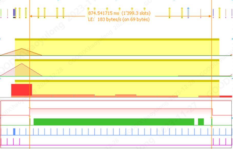 下图是4组IO时序信号(红、绿、蓝、紫)分别代表NVDS GC、Flash Write、BLE Stack IRQ、BLE Event。