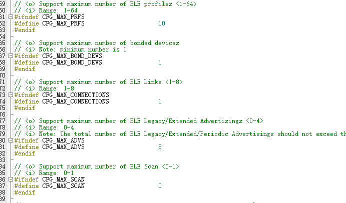 CFG_MAX_ADVS 注释表示范围为0-4 但我实际上,将其改为5也能够编译通过,但实际上最大广播个数仍为4个广播。但我自己的工程如果这里是4,那么仅能完成4个通道广播,改为5就可以实现同时5条通道的广播了,虽然符合使用需求,但是担心可能会存在其他问题。